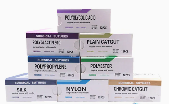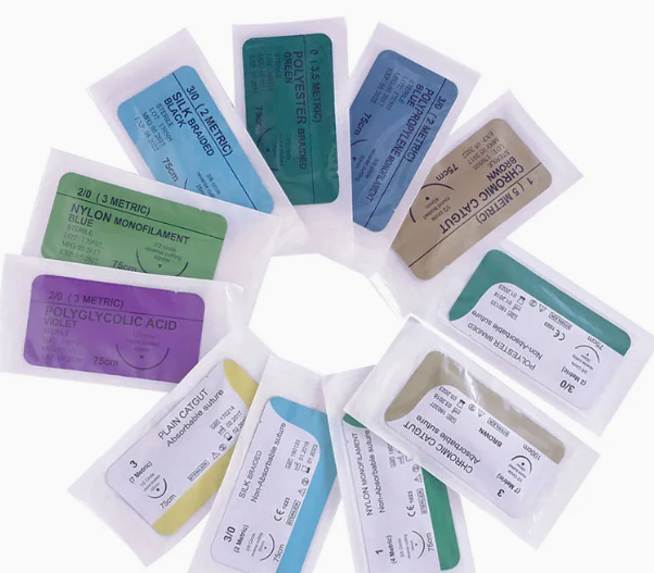 5. أحجام ومواد متاحة للمواد في خيارات قابلة للامتصاص (على سبيل المثال ، Vicryl ، monocryl) وخيارات غير قابلة للامتصاص (على سبيل المثال ، النايلون ، الحرير).